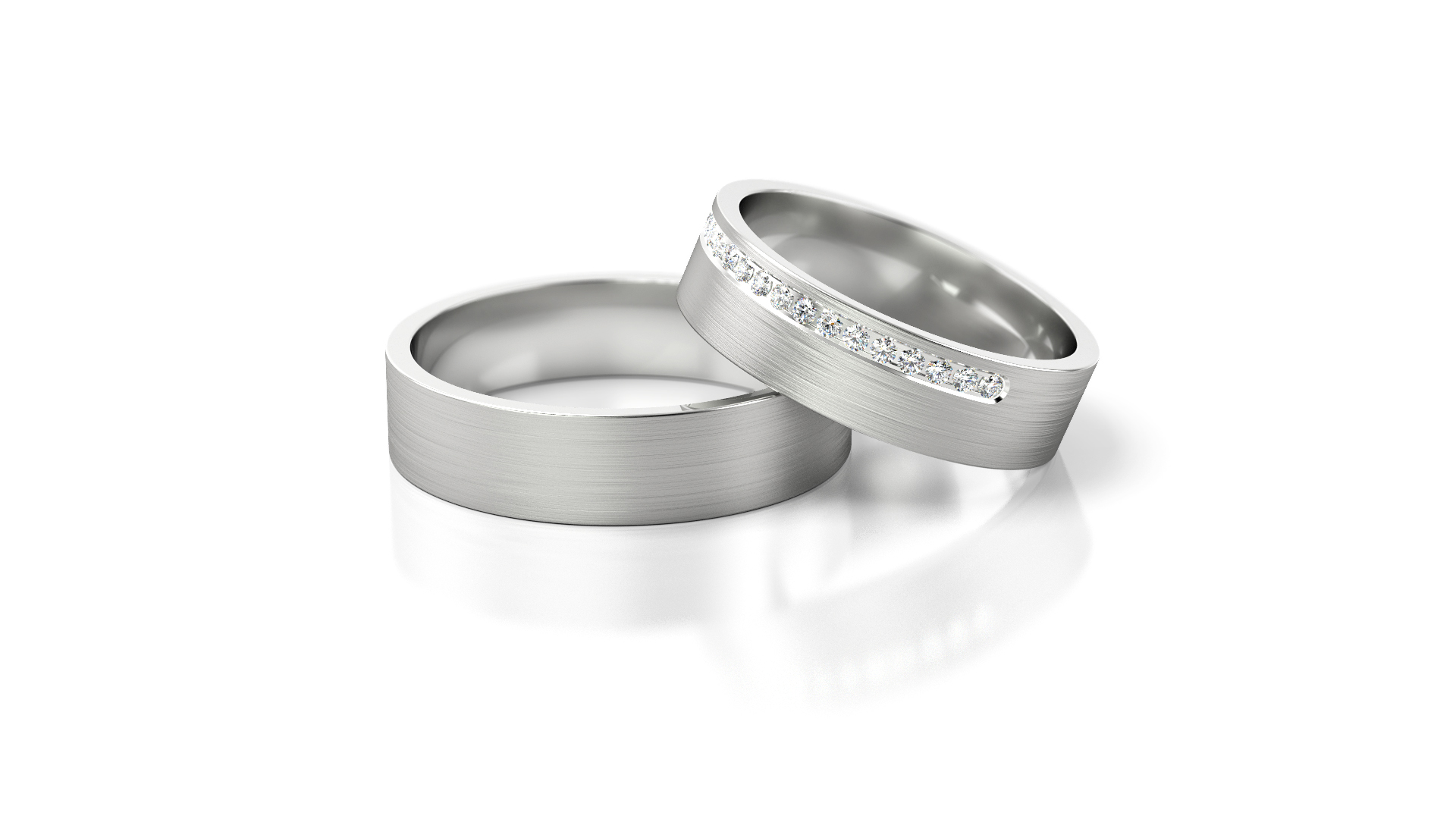 Velmi luxusni snubní prsteny z bílého zlata, provedeny v povrchové matné úpravě. Zasazeny jsou syntetické kameny, možno vsadit i brilianty.