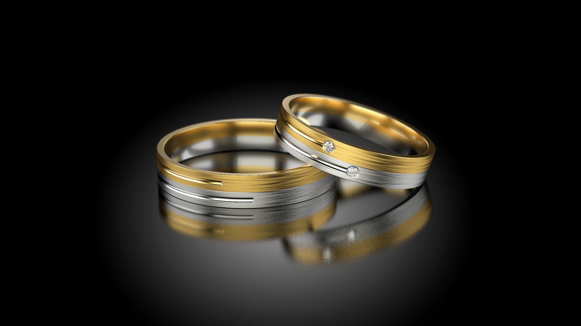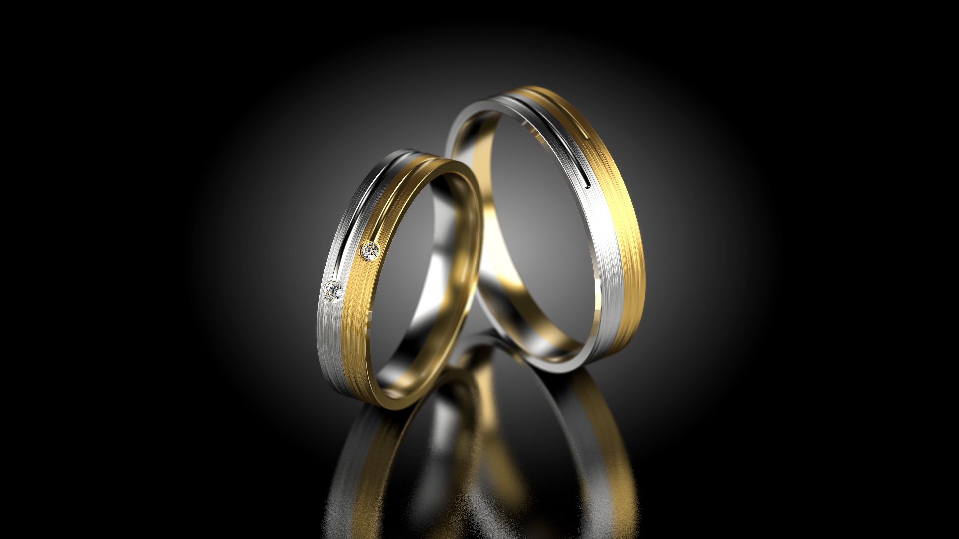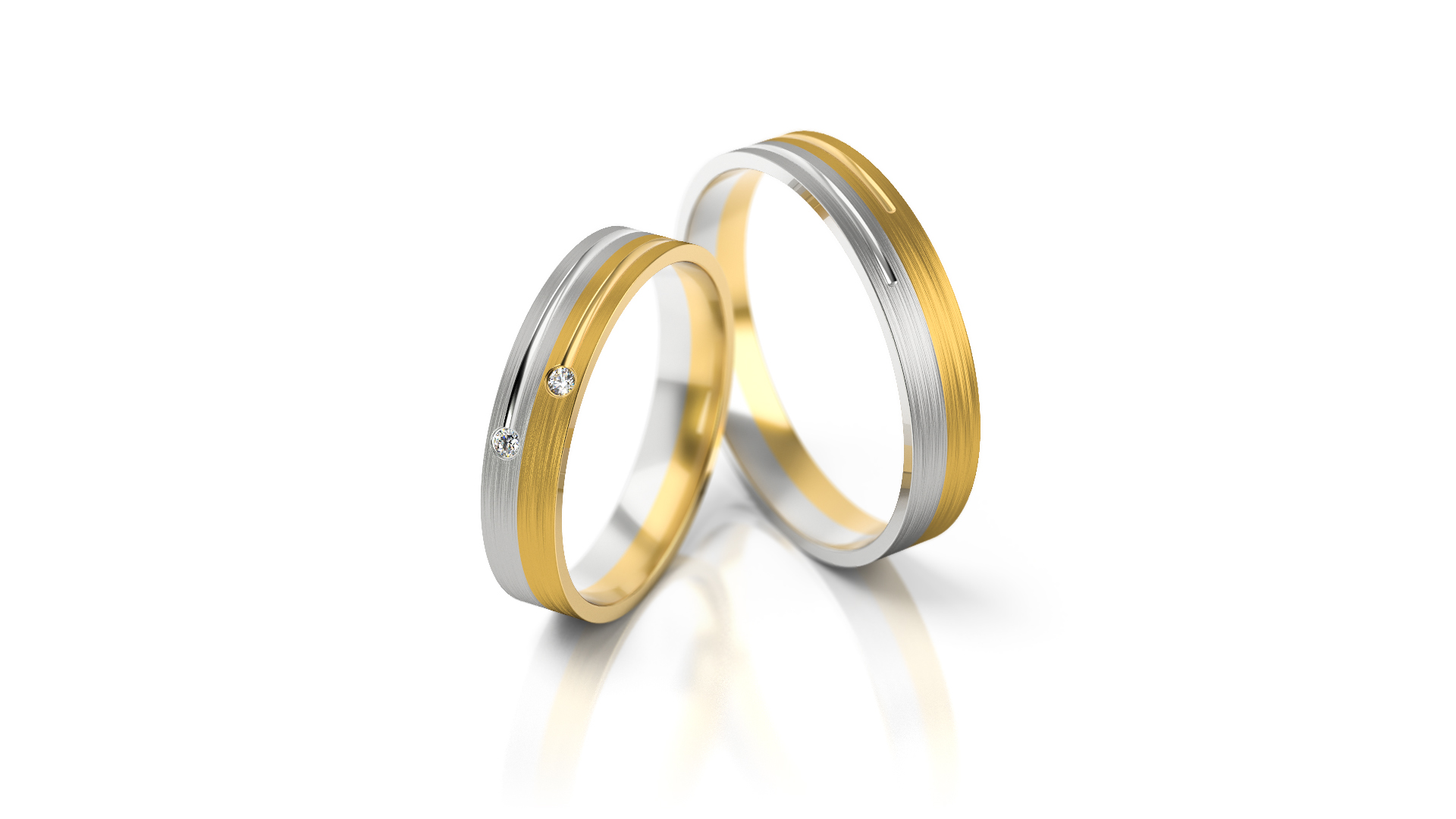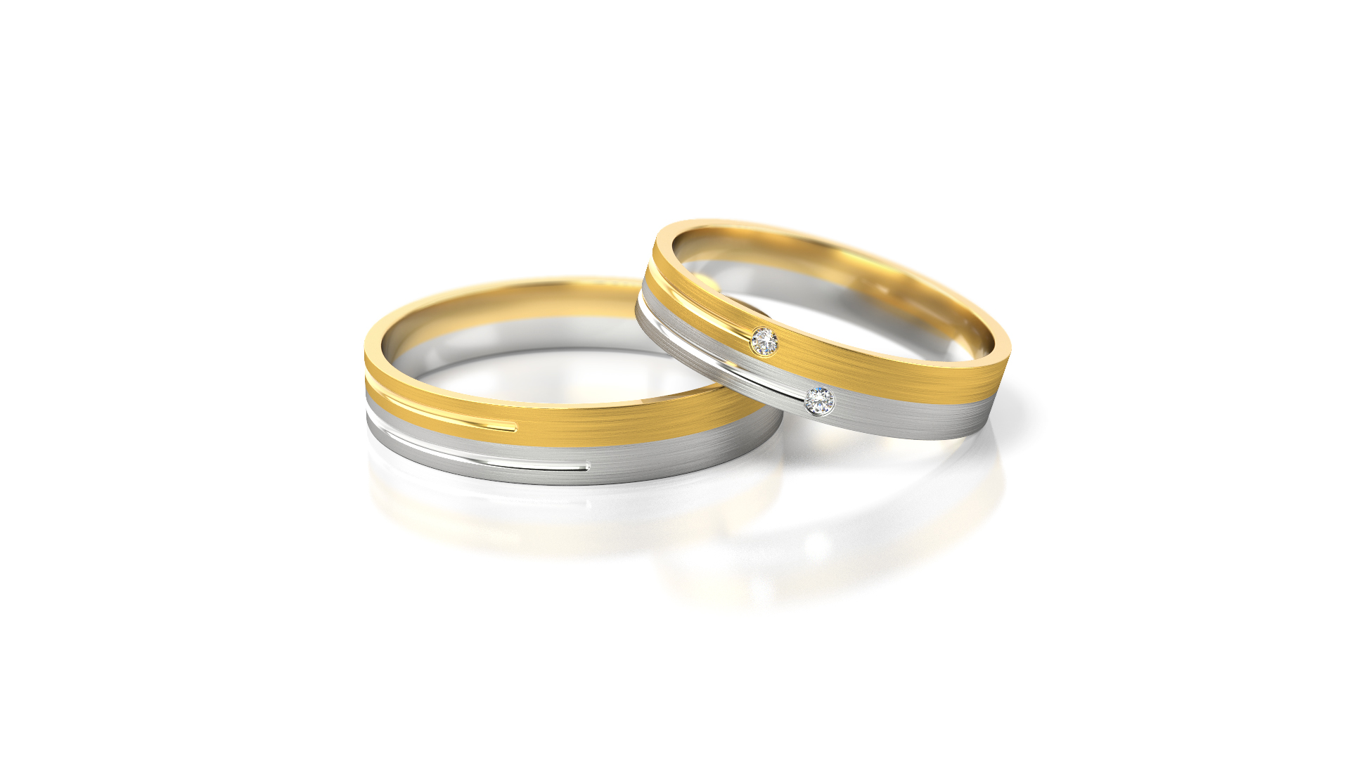 Snubní prstýnky s rovným profilem, kombinace žlutého a bílého zlata se dvěma vsazenými zirkony.