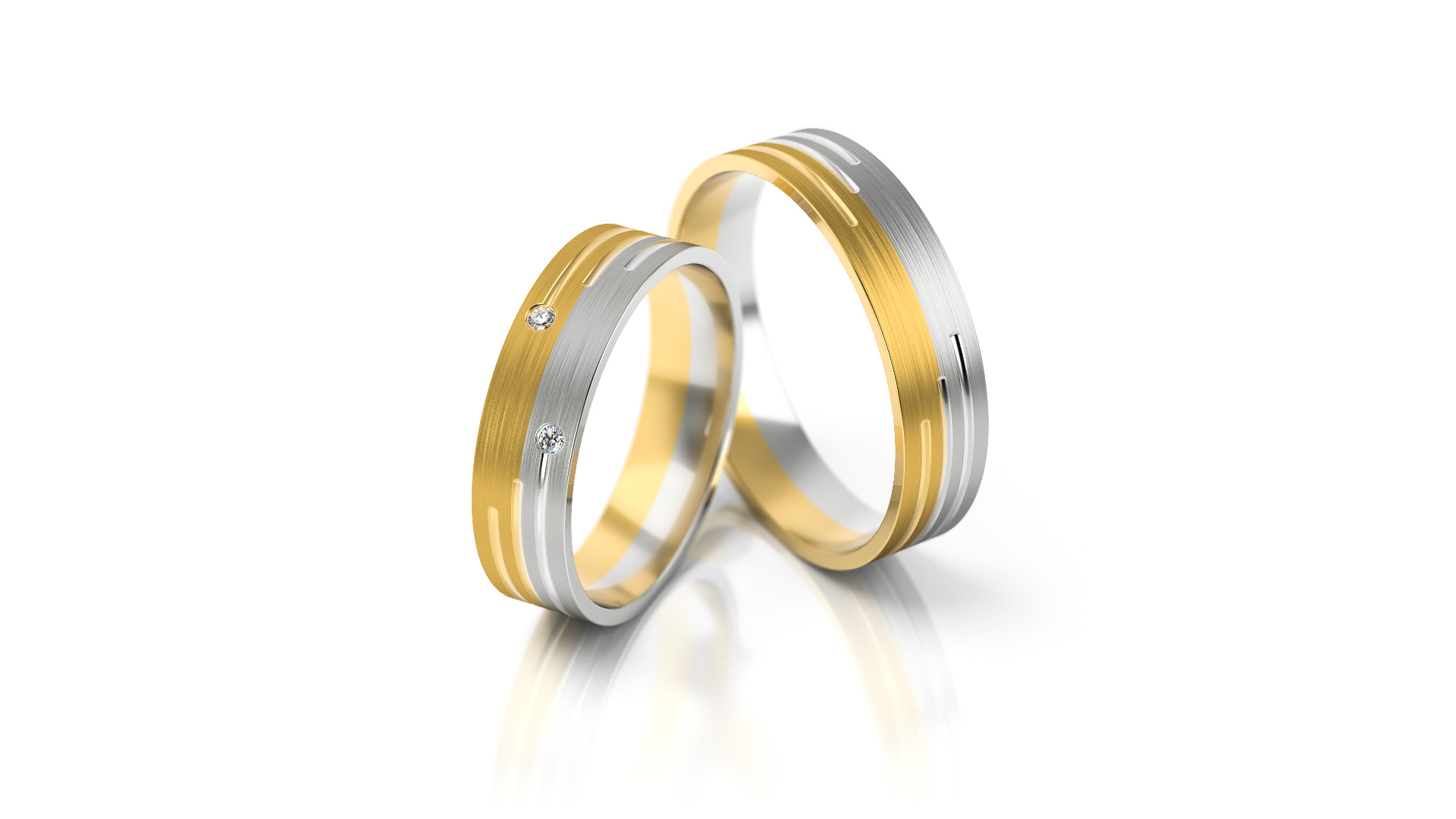 Zajímavě řešené snubní prsteny v kombinaci žlutého a bílého zlata, rovný profil, tři drážky, dva zirkony.